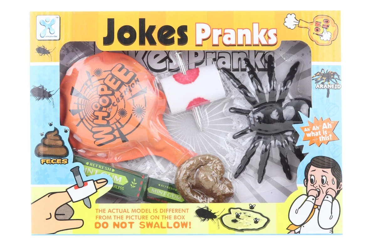 Zábavná sada žartovných predmetov pre malých aj veľkých vtipkárov prináša hodiny smiechu a prekvapení. Obsahuje prdací vankúšik, falošné hovienko, pavúka, klinček s obväzom a žuvačky s pascou. Ideálna na oslavy, párty aj domácu zábavu. Vhodné pre deti od 3 rokov.