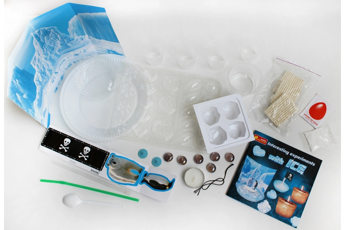 Balenie zahŕňa pestrý výber nástrojov a materiálov: formičky na ľad, plastelínu, sviečku, kamienky, kelímky, slamku, potravinárske farbivo, šablóny, niť a ďalšie potreby. Nechýba ani zrozumiteľný slovenský návod krok za krokom, takže sa do experimentovania môžu deti pustiť takmer ihneď.