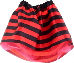 Súčasťou sú priesvitné ružovo-červené krídla s trblietavými bodkami, elastická sukňa v červeno-čiernom prúžku, čelenka s pružnými tykadlami a ladiaca palička so stužkami. Veľkosť sady je navrhnutá pre deti od 3 rokov; rozmer balenia cca 49 × 57 cm.