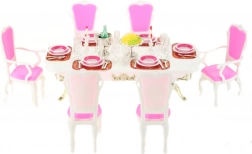 Vytvorte dokonalú večeru pre bábiky s kompletnou sadou Glorie. Veľký stôl a šesť stoličiek poskytujú dostatok miesta pre hostí, zatiaľ čo detailné doplnky dodajú hre realistický nádych. Sada je navrhnutá na jednoduché používanie deťmi a podporuje fantáziu, komunikáciu a jemnú motoriku.