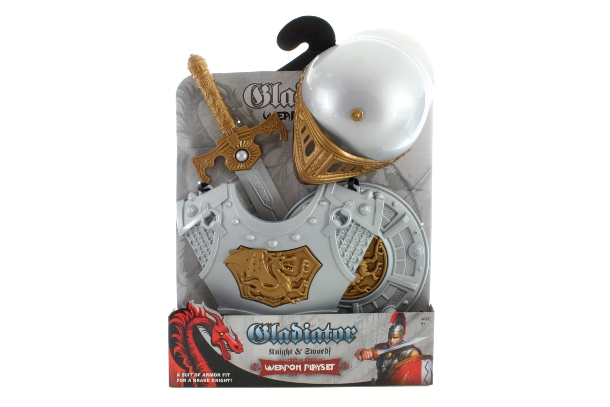 Súčasťou je dekoratívny meč a štít, ktoré dopĺňa hrudné brnenie a prilba pre autentický vzhľad. Sada je vyrobená s ohľadom na pohodlie a jednoduché obliekanie, takže sa hodí na kostýmy, karneval aj voľné hranie.