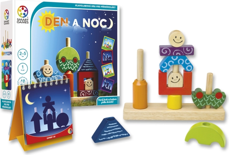 Deň a noc je múdro navrhnutá logická hra pre jedného hráča, ktorá deti prevedie od prvých jednoduchých skladačiek až po náročnejšie priestorové úlohy. Na denných kartách sú viditeľné všetky detaily, zatiaľ čo nočné karty ukazujú len obrysy – dieťa tak trénuje predstavivosť, pozornosť a jemnú motoriku.