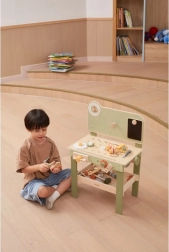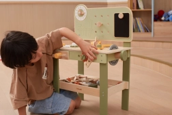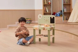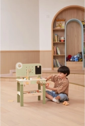 Štýlový detský ponk v prírodno‑zelenom prevedení ponúka realistický zážitok z dielne v bezpečnej, drevenej podobe. Deti môžu skrutkovať, meniť kolieska na autíčku, „rezať“ dieliky, skladať ozubené kolieska a objavovať princípy príčiny a následku. Vďaka prehľadnému úložnému priestoru zostanú všetky diely a náradie vždy po ruke.
