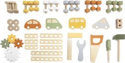- Bohaté príslušenstvo: náradie, skrutky, matice, doštičky, ozubené kolieska, autíčko a hodiny s ručičkami.