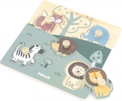 Drevené puzzle PolarB kombinujú kvalitný materiál a premyslený dizajn pre malých prieskumníkov. Každý dielik má drevený úchyt na ľahké uchopenie drobnými prstíkmi a presné osadenie do príslušného výrezu. Pod každý tvar je na podložke nakreslený obrázok zvieratka, ktorý deťom napovie a motivuje ich skladať ďalej.