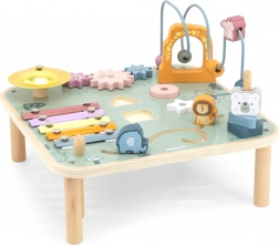Drevený aktívny stolík VIGA PolarB prináša deťom od 18 mesiacov hodiny objavovania a kreativity. Kombinuje guľôčkový labyrint, xylofón, gong, triedenie tvarov, posuvné prvky a ozubené kolieska. Povrch je lakovaný a farebný netoxickými farbami v jemných pastelových odtieňoch, ktoré lákajú k hre a rozvíjajú jemnú motoriku, koordináciu oko–ruka aj rozpoznávanie farieb a tvarov.