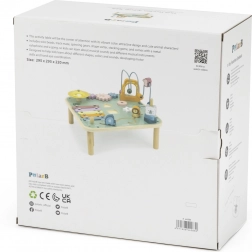 Korálkový labyrint, ozubené kolieska, posuvné prvky aj triedenie tvarov v jednom stolíku pre rozvoj jemnej motoriky a logiky.
