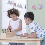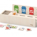 Hračka učí deti správnemu triedeniu odpadu s využitím hravých drevených doštičiek a farebne označených košov.