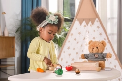 Sada umožňuje deťom precvičovať jemnú motoriku pri krájaní a skladaní zeleniny do pôvodných tvarov.