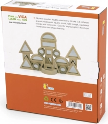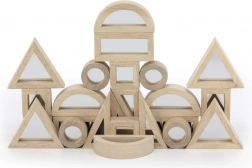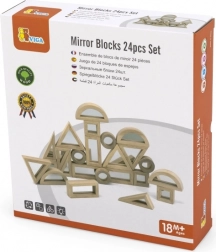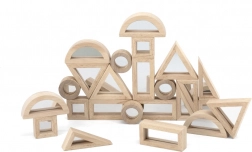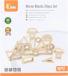 Súprava obsahuje 24 drevených obojstranných kociek so zrkadlami, ktoré deťom pomáhajú rozvíjať koordináciu očí a rúk a poznávanie rôznych tvarov. V balení nájdete šesť rôznych tvarov vrátane obdĺžnikových, štvorcových, okrúhlych, pravouhlých trojuholníkov, rovnostranných trojuholníkov a polkruhových tvarov. Vďaka zrkadlám deti tiež rozvíjajú pocit vlastného "ja", čo zvyšuje ich sebavedomie.