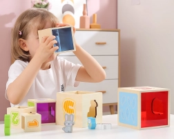 Plastové priehľadné steny kociek poskytujú ďalšiu dimenziu hry, pretože odrážajú svetlo a umožňujú deťom sledovať, ako sa mení obraz sveta okolo nich. Tým sa otvára priestor pre kreativitu a pozorovanie svetla a farieb.