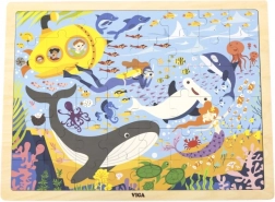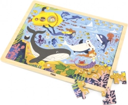 S dreveným puzzle Morský život objavíte úžasnú paletu morských živočíchov, ako sú veľryby a rybky, to všetko vrátane žltej ponorky.