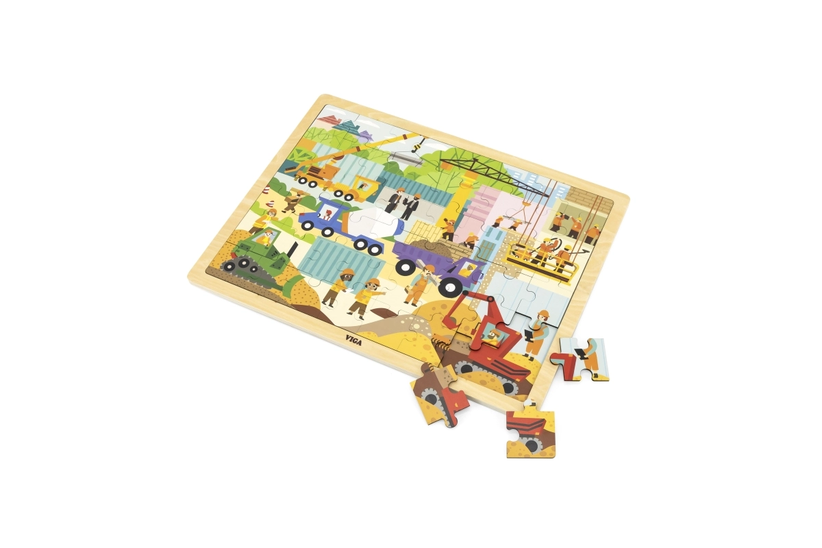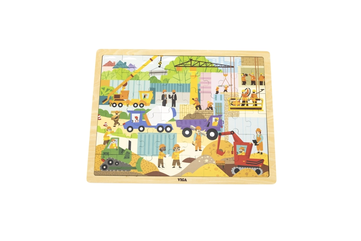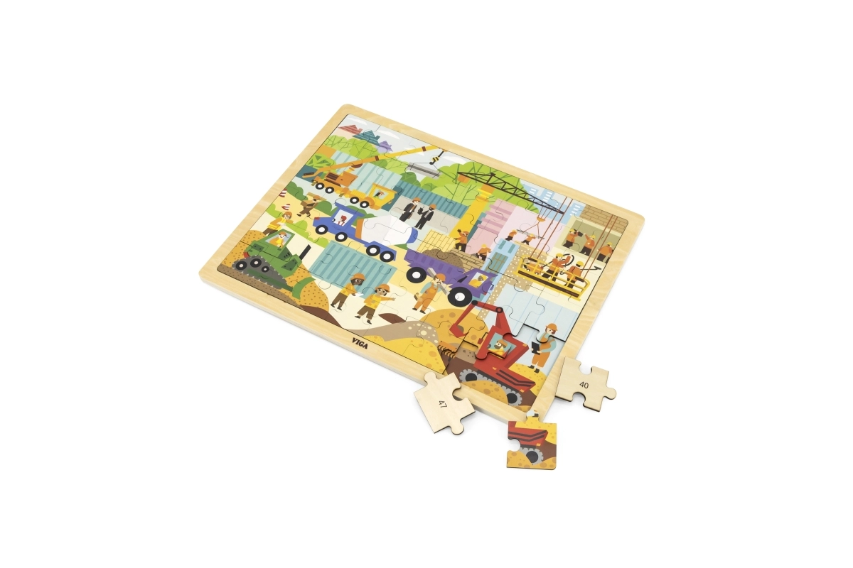 Toto kvalitné drevené puzzle s motívom staveniska je ideálnou voľbou pre prvé väčšie skladačky. Vďaka 48 presne vyrezaným dielikom si deti precvičia koordináciu oko–ruka a naučia sa rozpoznávať tvary a farby. Pevná drevená podložka drží obrázok pohromade a uľahčuje manipuláciu.