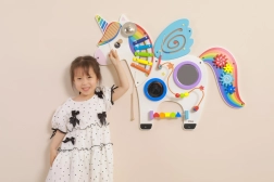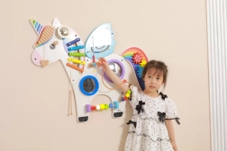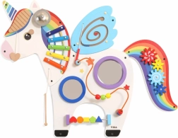 Táto multifunkčná nástenná tabuľa v podobe jednorožca kombinuje hudobné, hmatové aj logické prvky do jedného atraktívneho celku. Deti si zahrajú na xylofón, pretočia ozubené kolieska, vyskúšajú magnetický labyrint aj zrkadielka a precvičia si farby, tvary a koordináciu pohybov.