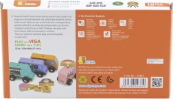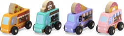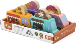 Drevená sada food truckov Viga prináša štyri roztomilé vozidlá na kolieskach v pastelových farbách s detailnými potlačami. Každý truck má tematický banner – pizza, káva, zmrzlina a donuty – ktorý možno ľubovoľne prehadzovať, takže deti môžu tvoriť vlastné príbehy a prevádzky. Kvalitné drevo a netoxické farby zaistia bezpečnú a dlhotrvajúcu zábavu.