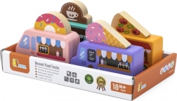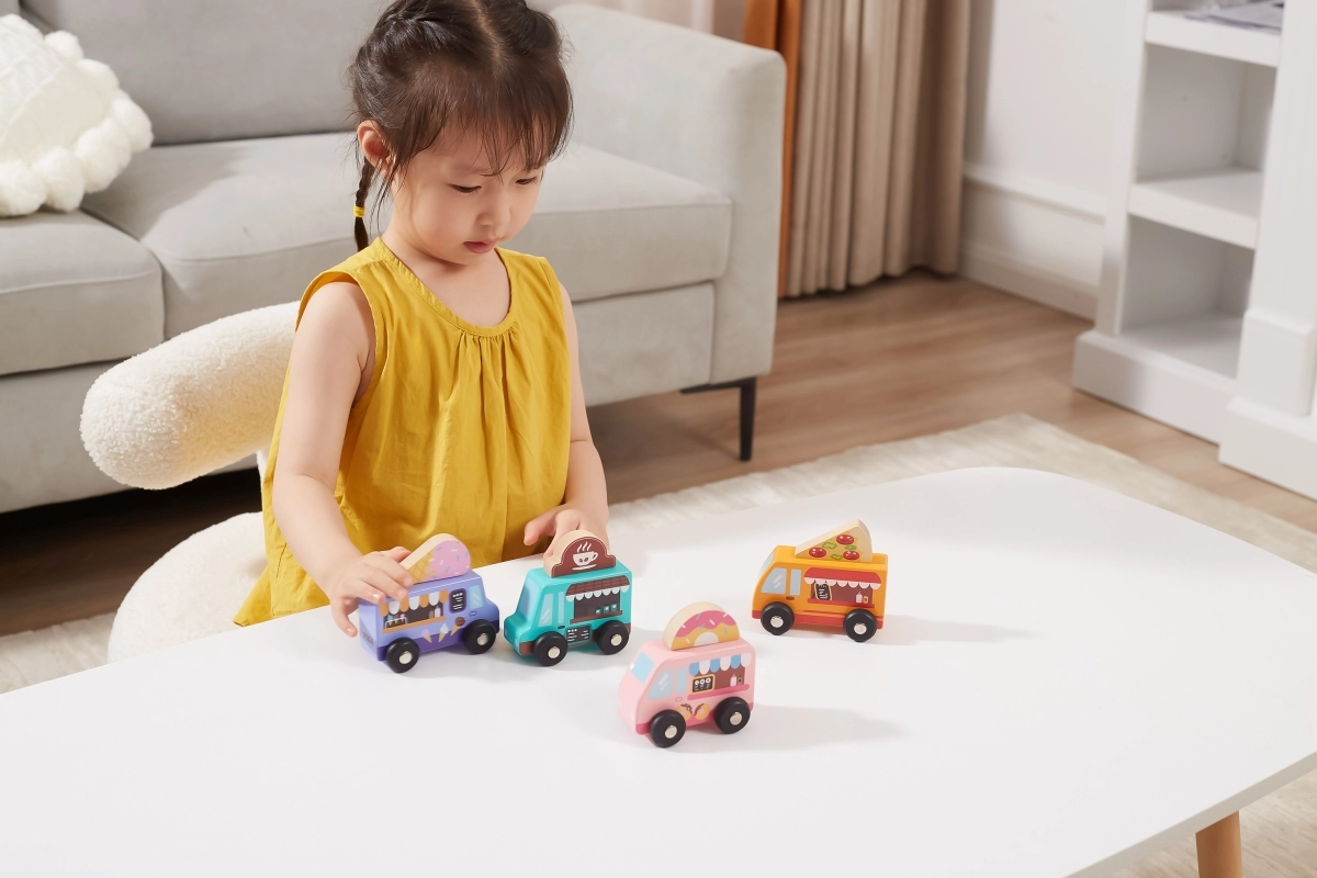 Horné cedule s motívmi pizze, kávy, zmrzliny a donutov možno ľahko prehadzovať. Deti si tak zostavia vlastný food truck podľa fantázie a rozvíjajú role-play.