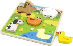 Táto roztomilá drevená skladačka s témou farmy obsahuje 5 robustných dielikov – koníka, ovečku, sliepočku, psíka a káčatko. Deti vkladajú zvieratká do zodpovedajúcich otvorov na farebnej podložke, čím si trénujú rozpoznávanie tvarov a vizuálnu pamäť.