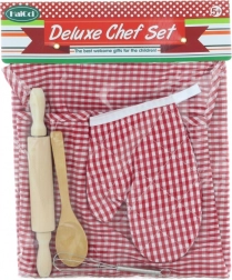 Kompletný detský kuchynský set pre malých kuchárov od 5 rokov obsahuje všetko potrebné na prvé varenie a pečenie. Nájdete v ňom zásteru, chňapku, drevený valček (cca 20,5 cm), drevenú varešku (cca 14,5 cm) a kovovú metličku (cca 12,5 cm). Ideálne na rozvoj jemnej motoriky, kreativity a bezpečnej hry v kuchyni.