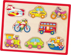 Táto kvalitná drevená vkladačka s motívmi vozidiel (lietadlo, taxík, bicykel, autobus a i.) ponúka zábavnú formu učenia. Dieliky s praktickými úchytmi zapadnú do vopred vyfrézovaných otvorov a deti si tak prirodzene trénujú zručnosť aj logické myslenie. Pevná drevená doska s rozmermi cca 30 × 22,5 cm je odolná a vhodná na každodenné hranie.