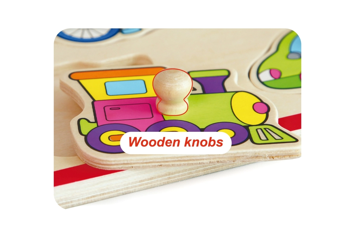 Každý dielik má drevený úchyt, vďaka ktorému deti dielik ľahko zdvihnú a presne vložia na svoje miesto – ideálne na tréning jemnej motoriky.