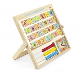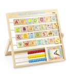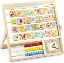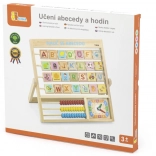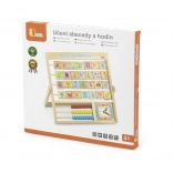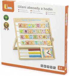 Drevená abeceda a hodiny v českom jazyku. Deti sa môžu naučiť písmená, čísla a získať všeobecnú predstavu o hodinách. Každé písmeno má na druhej strane slovo na lepšie zapamätanie. Rozmery cca 32,5 × 32 × 2,3 cm. Rozmery balenia cca 34 × 32,5 × 3 cm. Vek 3+