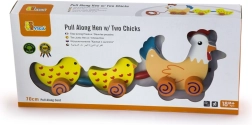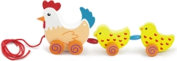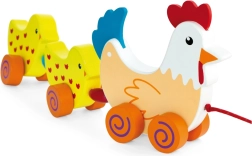 Táto drevená ťahacia hračka spája sliepočku a dve kuriatka červenou šnúrkou. Medzi kuriatkami sú umiestnené farebné koráliky, ktoré pri pohybe zaujmú zrak aj sluch dieťaťa. Pri ťahaní sa celá veselá „rodinka“ roztomilo pohupuje a motivuje deti k chôdzi.