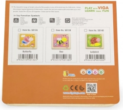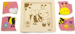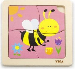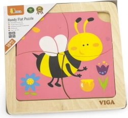 Puzzle obsahuje 4 dieliky s motívom včely, ktoré sa skladajú do obrázka na základnej doske.