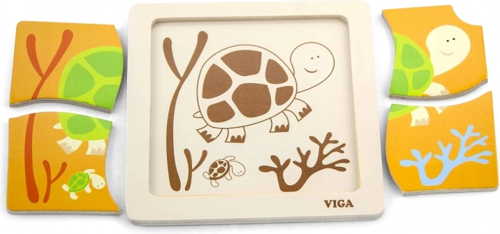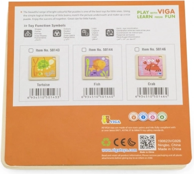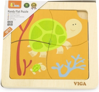 Drevené puzzle s korytnačkou je navrhnuté pre deti od 18 mesiacov. Skladá sa zo štyroch veľkých dielov, ktoré sa ľahko vmestia do dreveného rámčeka či môžu byť skladané samostatne. Každý diel je farebne pestrý a ponúka jedinečný spôsob, ako rozvinúť detskú priestorovú predstavivosť a koordináciu oko-ruka.