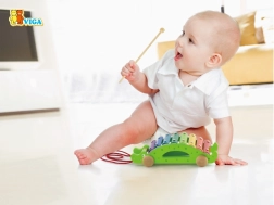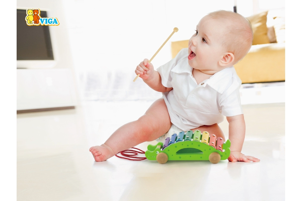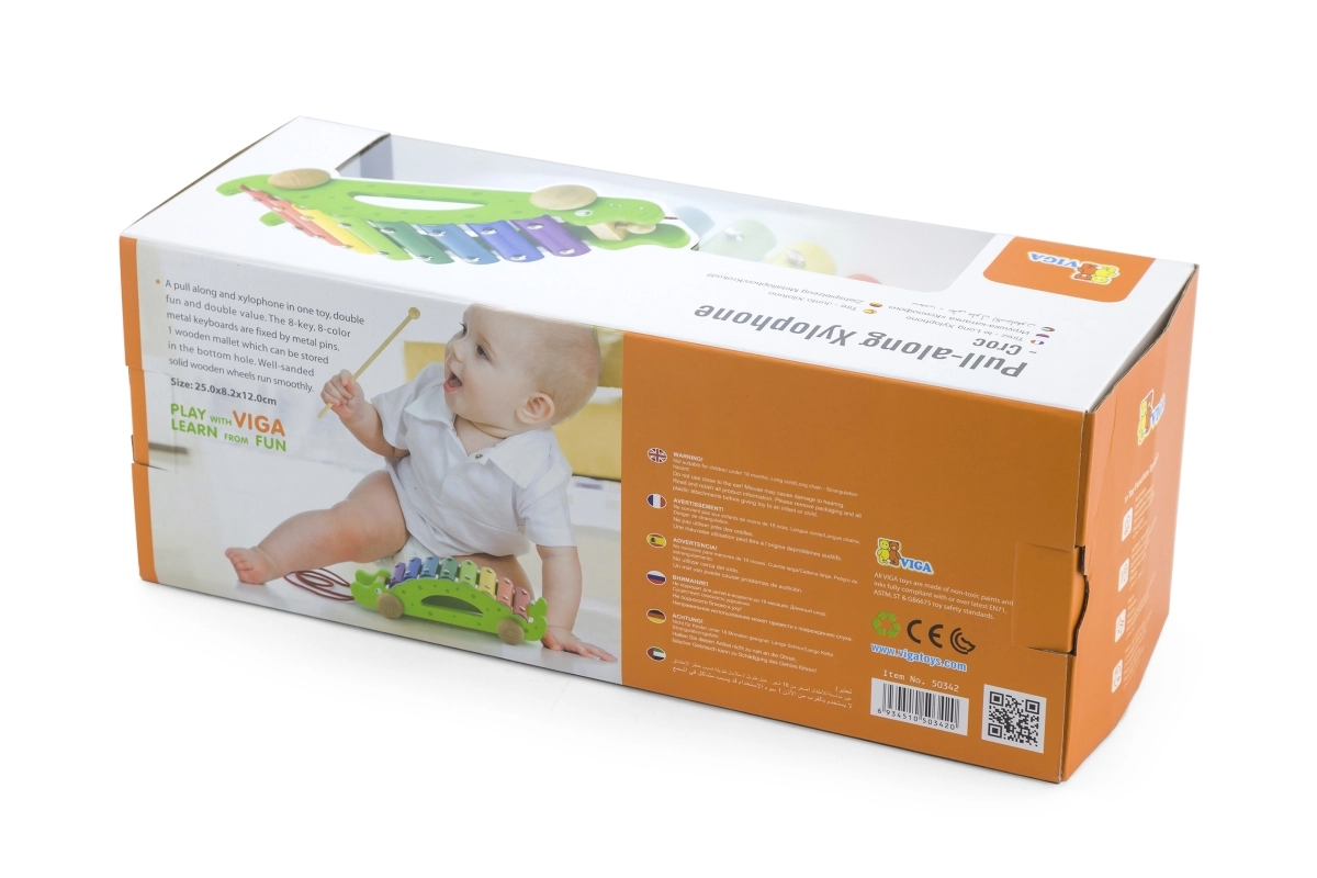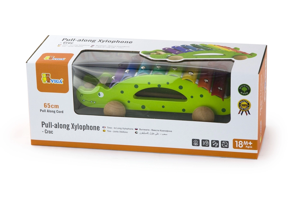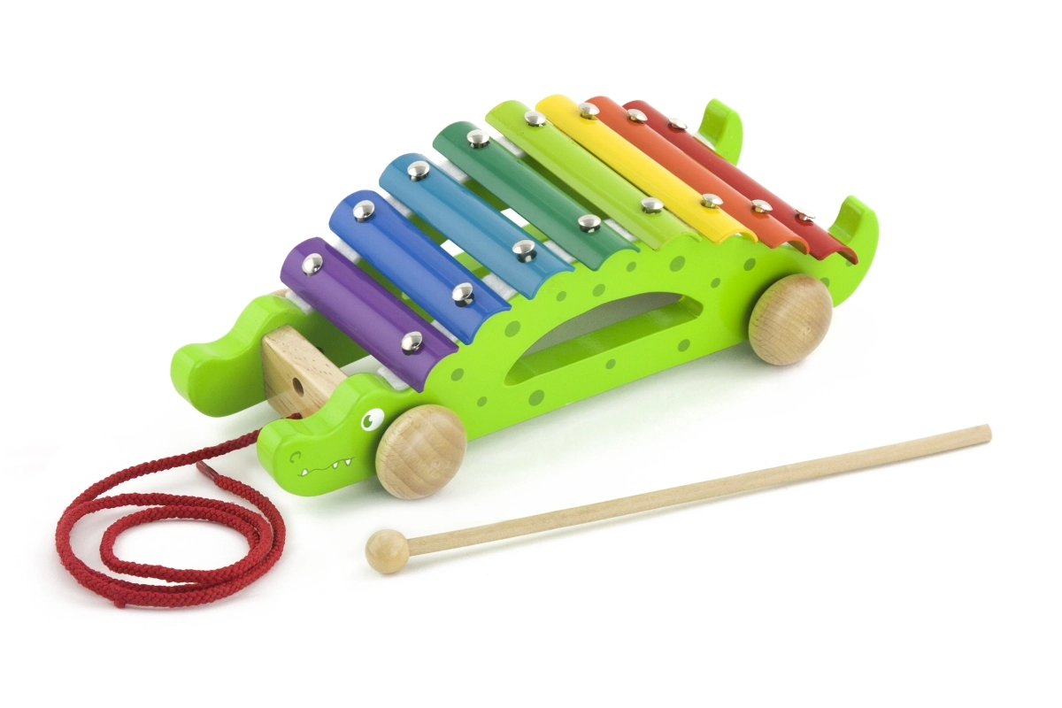 Farebné klávesy xylofónu lákajú k objavovaniu zvukov a učeniu rytmu, zatiaľ čo krokodíl jazdí na kolieskach za dieťaťom.