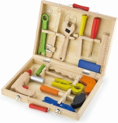Kompletná výbava pre malého majstra: kladivo, skrutkovač, kľúč, píla, „vŕtačka“ a ďalšie farebné nástroje v praktickom usporiadaní. Rozvíja jemnú motoriku a predstavivosť.
