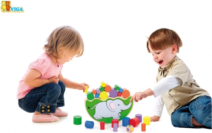 Klenutá slonia základňa a rôzne veľkosti valčekov učia deti citlivo vyvažovať a presne ukladať dieliky.