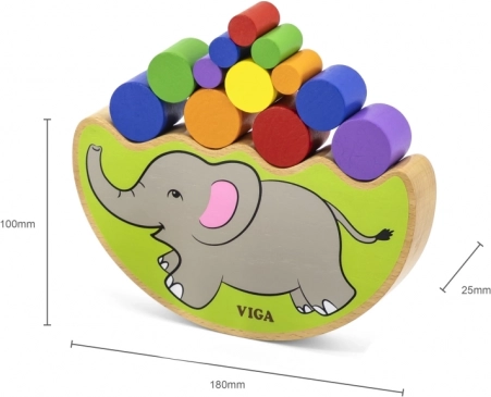 Zábavná drevená hra pre deti od 3 rokov, ktorá rozvíja jemnú motoriku, trpezlivosť a koordináciu oko–ruka. Hráči hádžu farebnou kockou a podľa padnutej farby odoberajú či ukladajú valček na sloniu základňu – bez prevrhnutia!