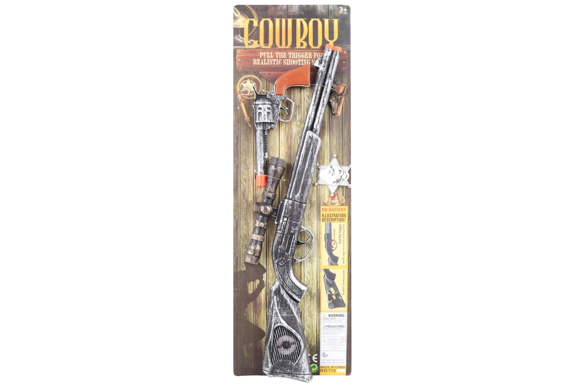 - Plastová puška so zameriavačom, pištoľ, odznak šerifa, prívesok
