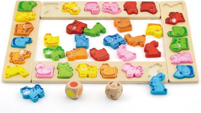 Zábavná drevená hra pre deti od 3 rokov, ktorá rozvíja rozpoznávanie farieb a zvierat, trénuje rýchle myslenie a reakcie a podporuje jazykové, početné a tímové zručnosti. Sada z kvalitnej preglejky a bukového dreva obsahuje 4 dosky, 36 zvieracích dielikov a dve kocky – farebnú a so zvieratami.
