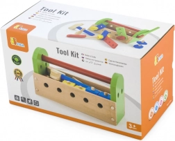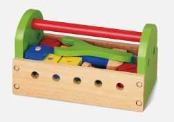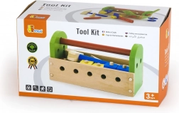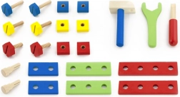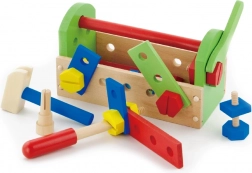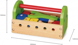 Zábavná a bezpečná drevená sada náradia pre malých majstrov od 3 rokov v praktickej prepravke. Obsahuje skrutkovač, kladivko, kľúč a farebné skrutky, matice a doštičky na skrutkovanie. Podporuje jemnú motoriku, koordináciu a fantáziu vďaka kvalitnému drevenému vyhotoveniu.