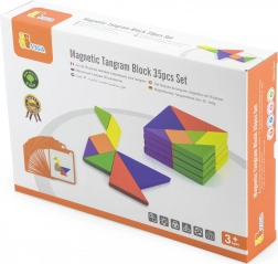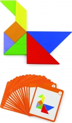 Tento farebný drevený tangram je ideálnou pomôckou na domáce hranie aj predškolské vzdelávanie. Deti skladajú obrázky podľa priložených kartičiek alebo podľa vlastnej fantázie, čím rozvíjajú priestorovú predstavivosť, tvorivosť a schopnosť riešiť problémy. Hladko opracované dieliky z masívneho dreva sú príjemné do ruky a odolné na každodenné používanie.