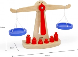Drevená balančná váha značky Viga je vybavená dvoma modrými miskami zavesenými na povrázkoch a obsahuje šesť červených závaží rôznych veľkostí. Vďaka svojmu farebnému dizajnu a bezpečnej povrchovej úprave prináša táto váha deťom veľa zábavy. Váha je navrhnutá tak, aby deti motivovala používať svoju predstavivosť a fantáziu pri hre na obchod, čo im pomôže pochopiť základné matematické koncepty a hodnotu rovnováhy.