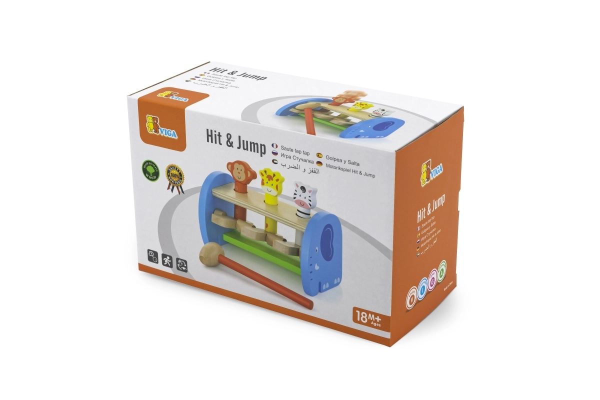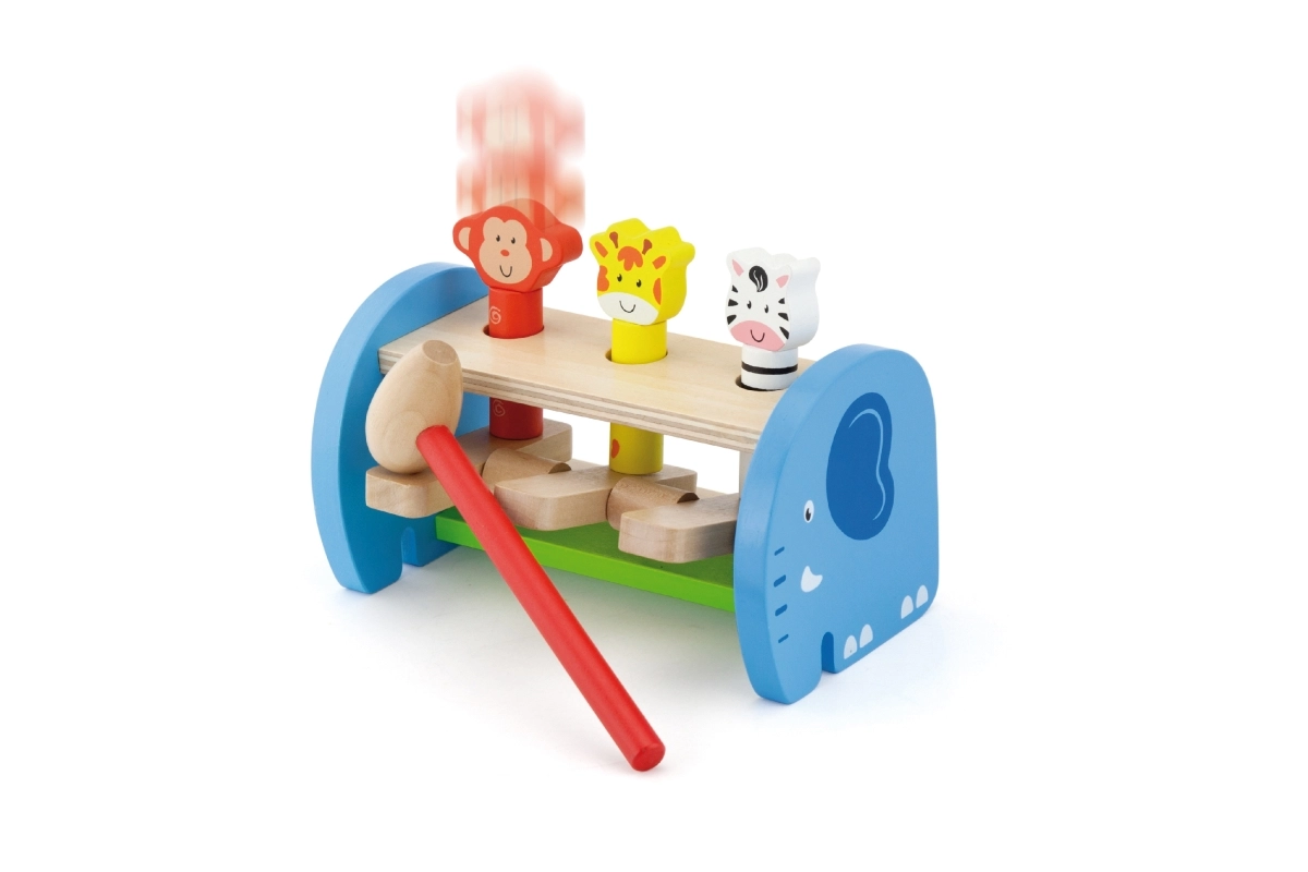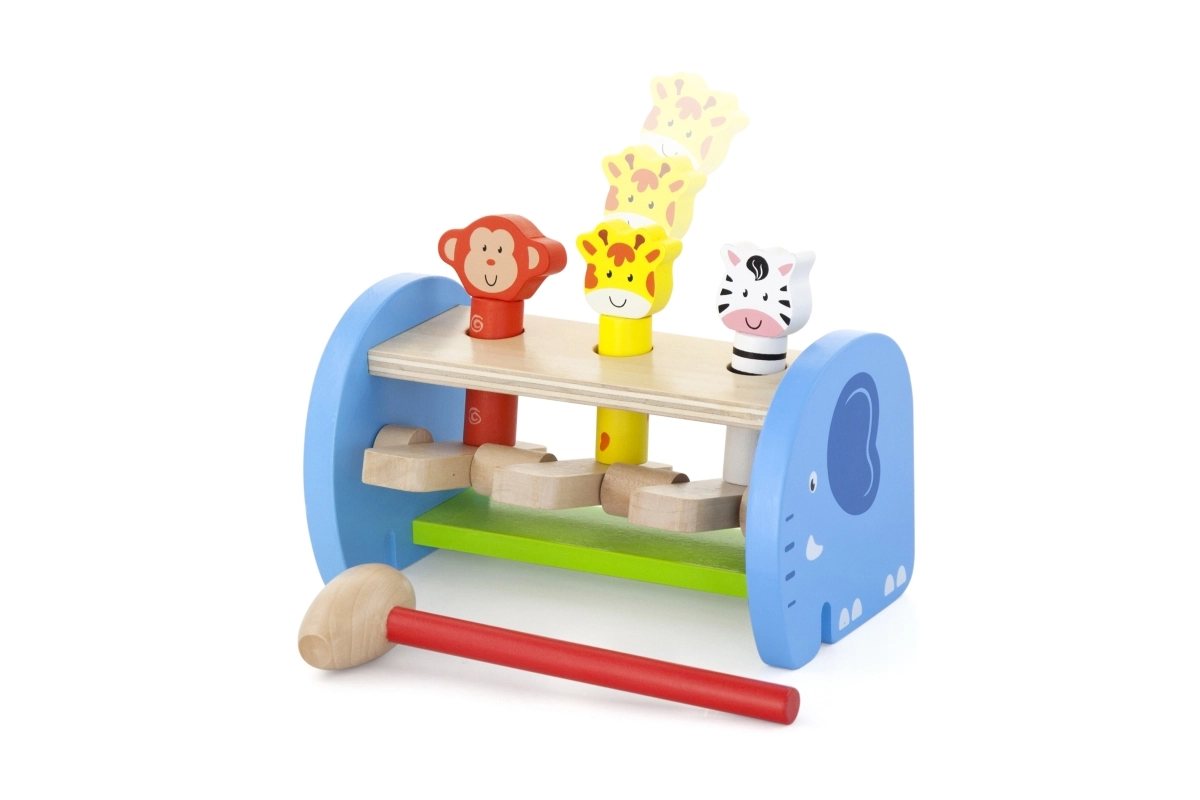 Táto kvalitná drevená hračka ponúka bezpečné a farebné hranie s roztomilými zvieratkami. Deti pomocou kladivka poklepávajú na mechanizmus, ktorý nechá zvieratká vyskočiť – zdokonaľujú tak úchop, silu stisku aj presnosť pohybu. Pevná konštrukcia a hladké hrany zaisťujú bezpečie pri každodennom používaní.