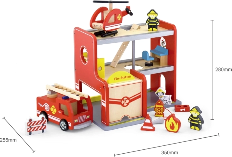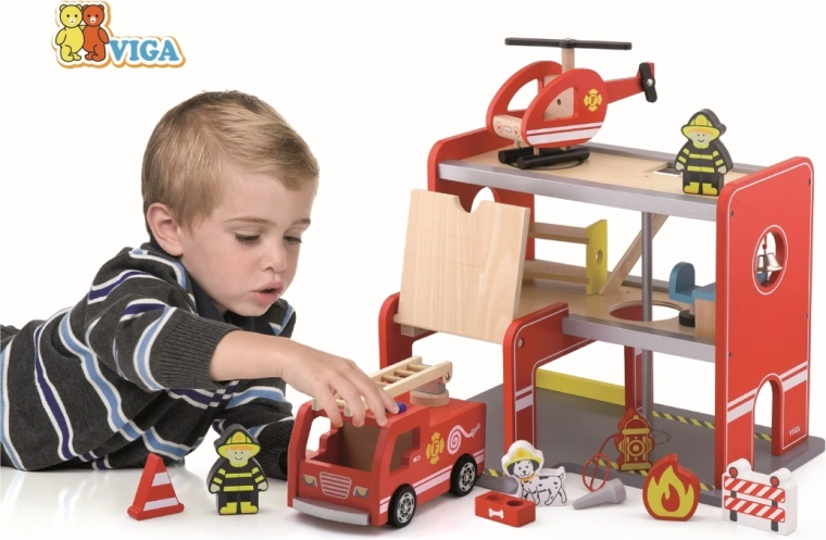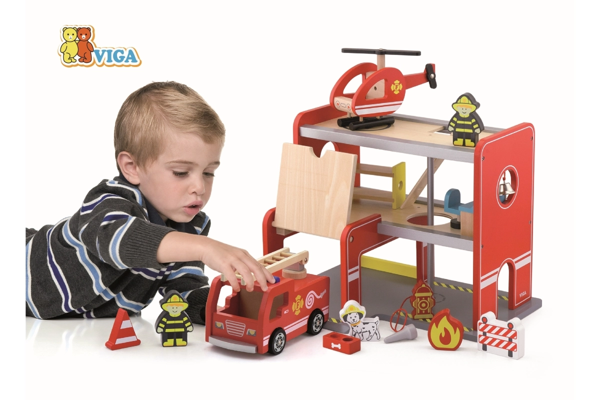 Drevená hasičská stanica Viga je kompletný herný set s viacerými poschodiami, ktorý podporuje rolové hranie, rozvoj jemnej motoriky a predstavivosti. Deti môžu vychádzať z garáže s autom, pristávať s vrtuľníkom na hornej ploche a spustiť sa rúrou priamo k zásahu. Farebné detaily a kvalitná drevená konštrukcia zaisťujú atraktívny vzhľad aj odolnosť pri každodennom používaní.