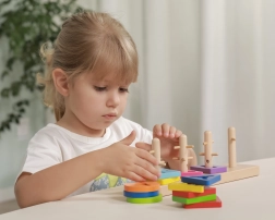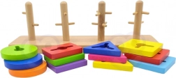 Vďaka skladaniu rôznych tvarov na drevené kolíky hračka podporuje rozvoj jemnej motoriky a koordinácie ruky a oka.