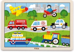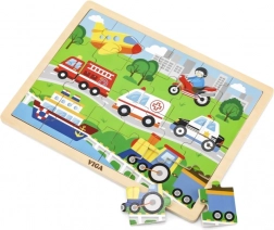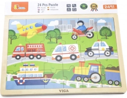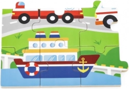 Táto drevená skladačka s obrázkami dopravných prostriedkov je skvelou voľbou pre prvé „väčšie“ puzzle. Vďaka 24 dielikom je skladanie výzvou akurát – podporuje sústredenie a radosť z dokončeného obrázka s rozmermi cca 27,5 × 20 cm. Farebné ilustrácie vozidiel (sanitka, hasičské auto, policajné vozidlo, loď, lietadlo a i.) deti prirodzene motivujú k opakovanému hraniu.