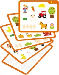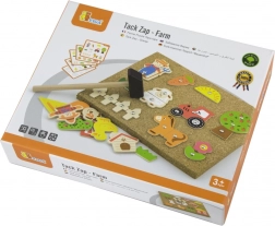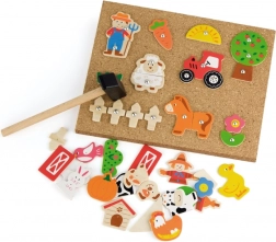 Táto drevená Montessori hračka podporuje samostatné objavovanie a koncentráciu. Dieliky s predvŕtanými otvormi sa jednoducho pripínajú pomocou špendlíkov na pevnú korkovú tabuľu, takže si deti môžu skladať traktory, zvieratká aj farmára stále dookola.