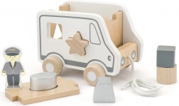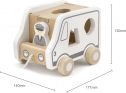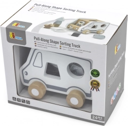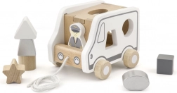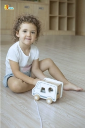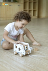 Táto drevená ťahačka v tvare nákladného auta spája dve obľúbené aktivity – ťahanie na šnúrke a vkladanie tvarov. Deti rozvíjajú poznávanie tvarov a priestorové vnímanie, zatiaľ čo si užívajú pohyb a fantazijnú hru s roztomilým autíčkom.