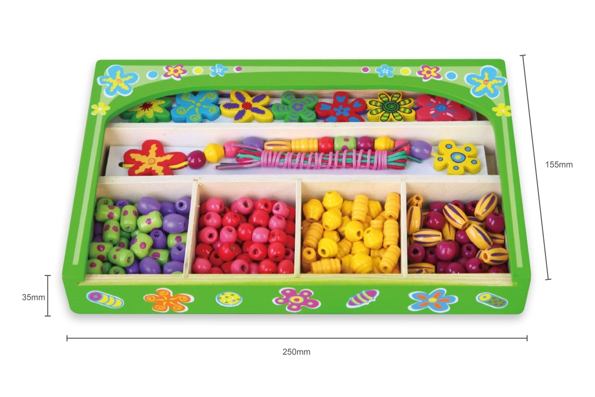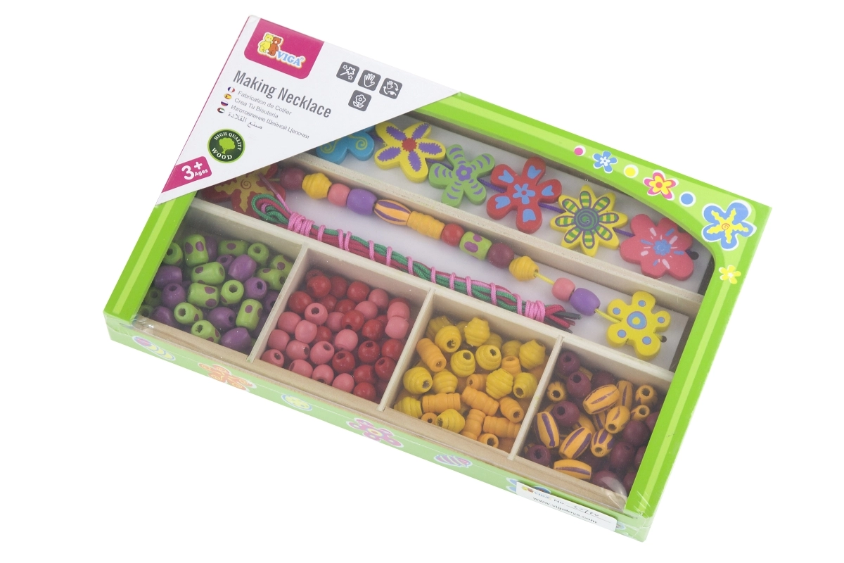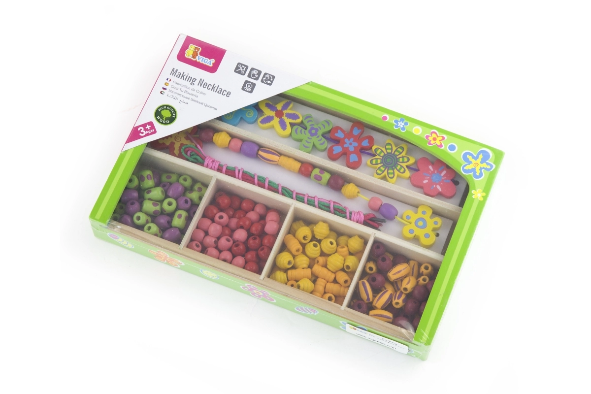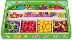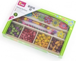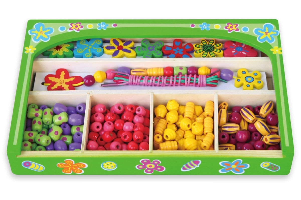 Táto drevená sada korálikov prináša deťom hodiny zábavy pri tvorbe originálnych náhrdelníkov a náramkov. V krabičke nájdete pestré koráliky rôznych tvarov a veľkostí vrátane kvetinových ozdôb a šnúrky na jednoduché navliekanie. Vďaka prehľadným priehradkám je výber korálikov jednoduchý a tvorenie prirodzene podporuje sústredenie a kreatívne vyjadrenie.