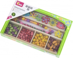 - Zmes drevených korálikov, ozdobné prvky, šnúrky na navliekanie, organizér s priehradkami