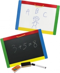 Táto univerzálna tabuľa spája dve kreatívne plochy v jednom – čiernu magnetickú stranu na kriedy a bielu stierateľnú stranu na fixku. Deti môžu písať, kresliť aj trénovať písmenká a číslice; na čiernej strane navyše ľahko prichytia magnetky. V balení nájdete všetko na okamžité použitie: 4 kriedy, stierateľnú fixku a hubku.