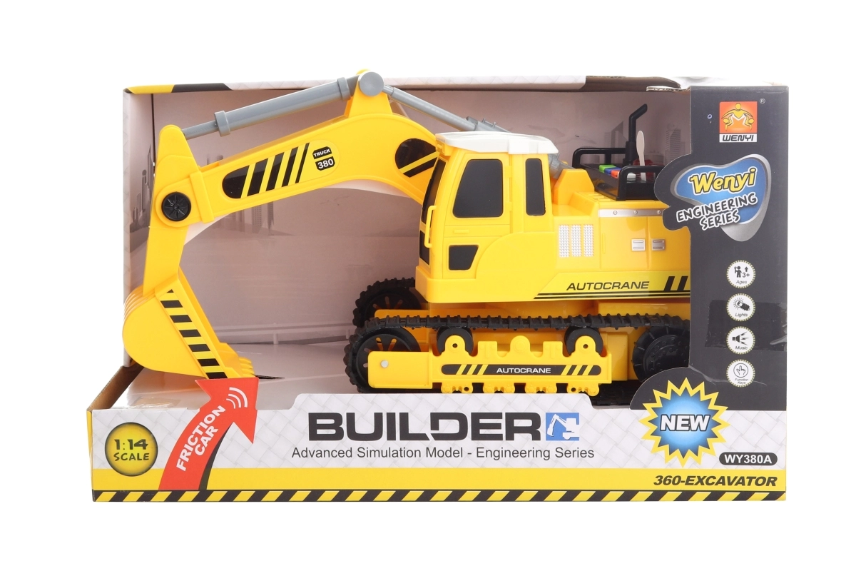 Stavebný bager na batérie (sú súčasťou balenia). Bager po stlačení tlačidiel svieti a vydáva zvuky. Má pohyblivú lyžicu. Rozmery bagra cca 30 × 13 cm. Vek 3+