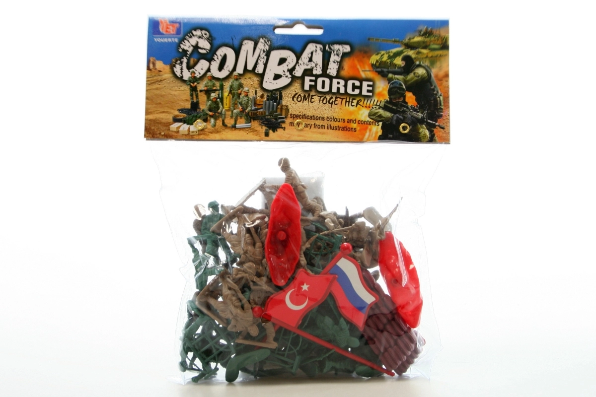 Klasická sada pre malých stratégov: plastoví vojaci v praktickom vrecúšku doplnení o vlajky a zábrany na tvorbu bojiska. Ideálne na kreatívnu hru, rozvoj fantázie a jemnej motoriky. Vhodné od 3 rokov.