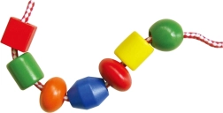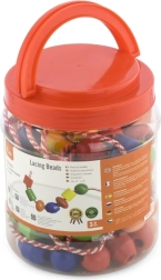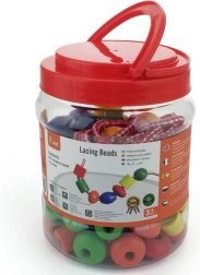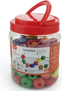 Plastová dóza obsahuje veľké drevené koráliky a farebné šnúrky, na ktoré možno koráliky navliekať. Rozmer korálika cca 2 × 2 cm podľa druhu. Rozmery balenia cca 16 × 12 cm. Obsahuje 90 korálikov a 5 šnúrok. Vek 3+