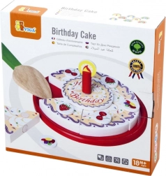 Drevená narodeninová torta na servírovacej tácke je rozdelená na jednotlivé porcie s dekoráciami a sviečkou. Vďaka suchým zipsom/magnetom (podľa prevedenia) sa dieliky ľahko oddeľujú a znova spájajú. Deti si precvičia uchopovanie, presnosť aj slovnú zásobu pri spoločnom „fúkaní sviečky“ a servírovaní.
